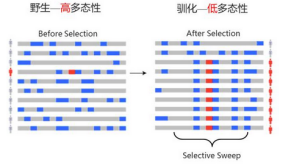 自然選擇促使有利突變?cè)谌后w中保留下來(lái),與之連鎖的中性位點(diǎn)突變頻率提升,非連鎖的中性位點(diǎn)突變頻率下降;簡(jiǎn)單的說(shuō)就是基因組某區(qū)域由于受到了選擇而消除多態(tài)性,即遺傳多樣性降低,在群體中出現(xiàn)高頻的等位基因和低頻的等位基因。