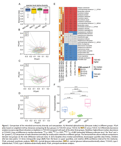 1、四組中不同的腸道微生物組特征在我們的健康人群和新診斷出的?T2D腹部肥胖人群中,擬桿菌、厚壁菌門和變形菌門是所有組中主要的門。這些門占腸道微生物組成的?96%?以上,其他細(xì)菌的豐度要低得多(平均低于?4%)。與其他三組相比,T2D-NO組厚壁菌門的相對豐度較高(30%),擬桿菌門的豐度較低(62%)。然而,在四組之間在門水平上沒有觀察到顯著差異(例如,厚壁菌門?p = 0.17,擬桿菌門?p = 0.31,Kruskal-Wallis?檢驗)。在分類分析后?,對四組間的多樣性進(jìn)行了比較。結(jié)果顯示盡管所有四組中的細(xì)菌集高度相似,但與其他三組相比,T2D-NO 組的豐度分布異于其他。更具體地說,在?T2D-NO?和?T2D-O?組(p = 0.012,PERMANOVA)(圖?2C)和?T2D-NO?和?NGT-O?組(p = 0.03,PERMANOVA)中差異顯著。NGT-NO?和?T2D-NO?組之間存在分離趨勢,但差異并不顯著(p = 0.108,PERMANOVA)。從?PCoA?中發(fā)現(xiàn)?NGT-O?和?T2D-O?組具有高度相似的整體腸道微生物群落特征(圖?2D)(p = 0.918,PERMANOVA)。在物種差異分析中發(fā)現(xiàn),盡管T2D-NO?和?NGT-NO?對照組沒有表現(xiàn)出顯著的群落水平差異,但發(fā)現(xiàn)兩個組之間的個體物種差異豐富(圖?2E),例如Akkermansia muciniphila ,Paraprevotella xylaniphila, Ruminococcaceae bacterium和Prevotella copri,,表明?T2D-NO?和?NGT-NO?組的特征在于某些微生物,而不是整個群落的巨大變化。4組的菌群共生網(wǎng)絡(luò)分析顯示NGT-O?網(wǎng)絡(luò)比?NGT-NO?對照組更小、更簡單,但比T2D-O?組更復(fù)雜(圖?2F)。對4組中菌群功能比較發(fā)現(xiàn),T2D-NO?個體的微生物群可能具有較低的碳水化合物利用能力和較高的BCAAs(支鏈氨基酸)?生產(chǎn)能力。此外,與?NGT-NO?微生物組相比,參與碳水化合物代謝(包括“半乳糖降解”)的?KEGG?模塊在?T2D-NO?中高度富集。