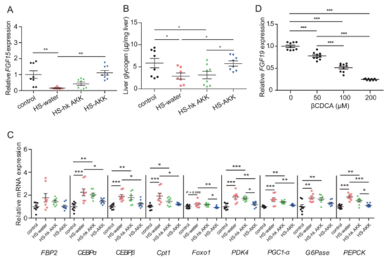 實驗結(jié)果表明,?A. muciniphila?治療顯著降低了 βCDCA?水平, 然而使用熱滅活的A. muciniphila并未導(dǎo)致βCDCA?水平顯著降低。這些結(jié)果與我們研究中觀察到的A. muciniphila豐度和βCDCA?水平之間的負(fù)相關(guān)一致。FGF19已被證明通過胰島素獨立途徑刺激糖原合成并抑制糖異生。臨床分析顯示,與NGT-NO組相比,T2D-NO組的血清FGF19水平顯著降低。FGF19水平與A. muciniphila在腸道菌群中的豐度呈正相關(guān),與βCDCA水平呈負(fù)相關(guān)。為了進(jìn)一步研究βCDCA是否能抑制FGF15/19的表達(dá),在CDCA存在的情況下,用不同濃度的βCDCA培養(yǎng)人結(jié)腸上皮細(xì)胞LS174T。我們發(fā)現(xiàn),CDCA聯(lián)合βCDCA處理LS174T細(xì)胞可導(dǎo)致FGF19 mRNA表達(dá)水平呈劑量依賴性下降,提示βCDCA對腸道FGF15/19表達(dá)有抑制作用。以上結(jié)果表明,A. muciniphila可能通過限制βCDCA的可用性,增強FGF15/19的表達(dá),進(jìn)而刺激糖原合成,抑制糖異生,至少部分抑制糖原合成。
