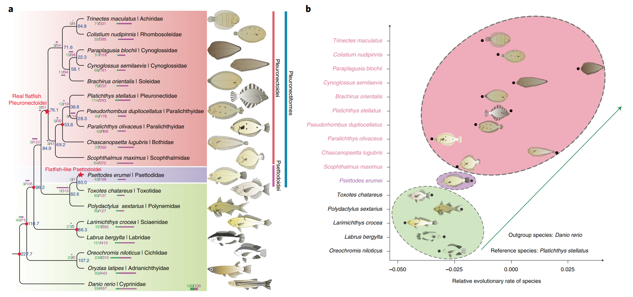 圖1 比目魚的多系起源與快速基因組進化(Lv Z et al., Nature Genetics.2021)