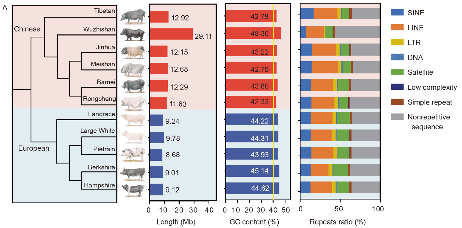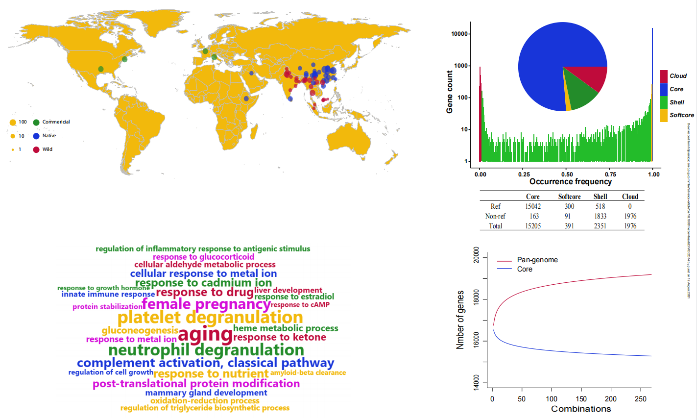 • 對于一些農(nóng)業(yè)畜牧養(yǎng)殖相關(guān)的動物,往往由于人工的干預(yù)或是自然環(huán)境的選擇,在同一個種內(nèi)水平下會有非常多的品系/亞種/變種。這些馴化前后的群體間表型和基因型的巨大差異可能隱藏在每個品系基因組種,因此能體現(xiàn)這些動物品系內(nèi)的共性又能體現(xiàn)不同品種間差異的泛基因組就顯得尤為重要。