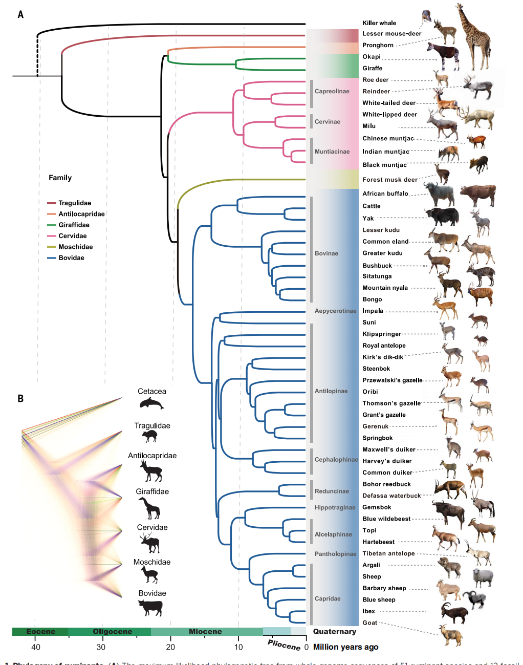 同樣這樣大規(guī)模不同科屬研究的還有2020年Nature封面文章,通過6種蝙蝠基因組揭示演化和潛在功能,探索蝙蝠有別于其他哺乳動物的免疫調(diào)節(jié)機制。以及2020年發(fā)表在Science上的反芻動物基因組,該研究共進行了6個科的44個反芻動物De novo組裝,結(jié)合化石信息,構(gòu)建了所有節(jié)點100%支持的全基因組系統(tǒng)發(fā)育樹,高置信度的進化樹進一步確認了叉角羚科與長頸鹿科的姐妹類群關(guān)系,以及麝科與??平忝妙惾宏P(guān)系等一直以來備受爭議的分類問題。并對反芻動物基因組結(jié)構(gòu)特征及演化進行研究,進而對反芻動物中的“消化系統(tǒng)”“多腔胃演化”“角形態(tài)”“體型”等特征進行解析。該研究基于大量的基因組數(shù)據(jù),將反芻動物基因功能與動物的適應(yīng)性性狀聯(lián)系起來,為動物譜系基因組打開了一個新的研究篇章。