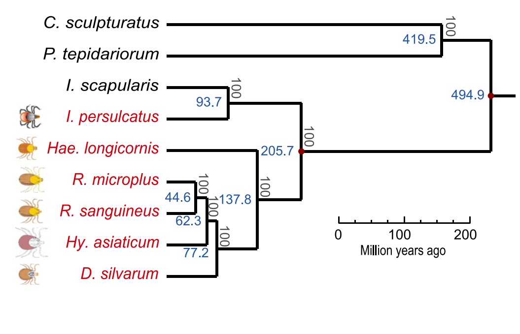 圖3 蜱蟲進化關(guān)系與基因組特征