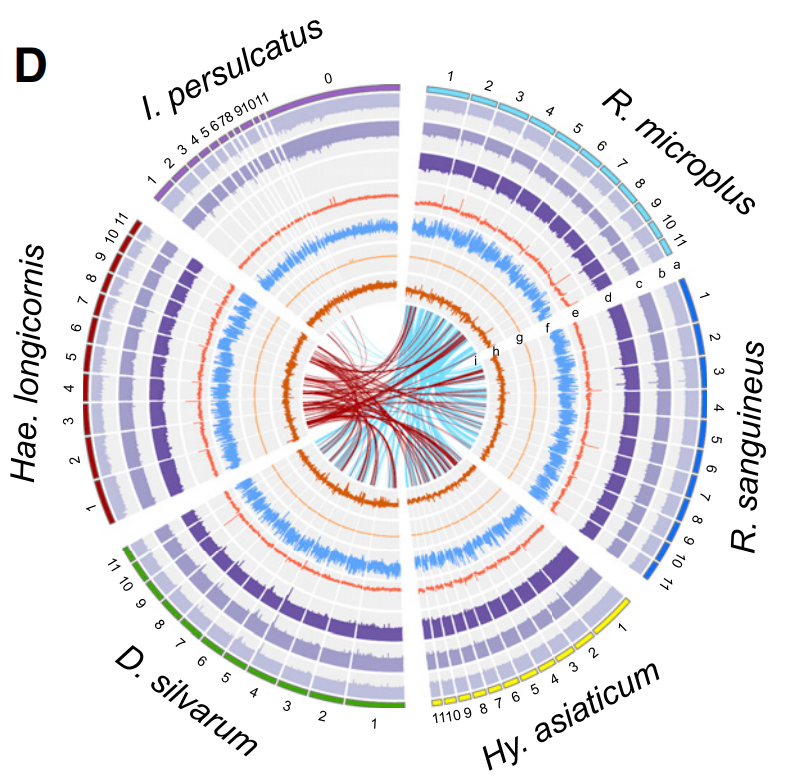 除了上述跨越科水平的譜系基因組研究,其實還有很多同科內(nèi)不同屬間的動物群體基因組。例如通過構(gòu)建硬蜱科內(nèi)6種蜱蟲基因組,解析不同蜱種的演化歷程,揭示了蜱專性吸血的遺傳機制以及蜱蟲遺傳多樣性及分布規(guī)律,并通過宏基因組學研究等方式探究了蜱媒病原體的生態(tài)分布和進化機制(Jia N et al., Cell.2020)。