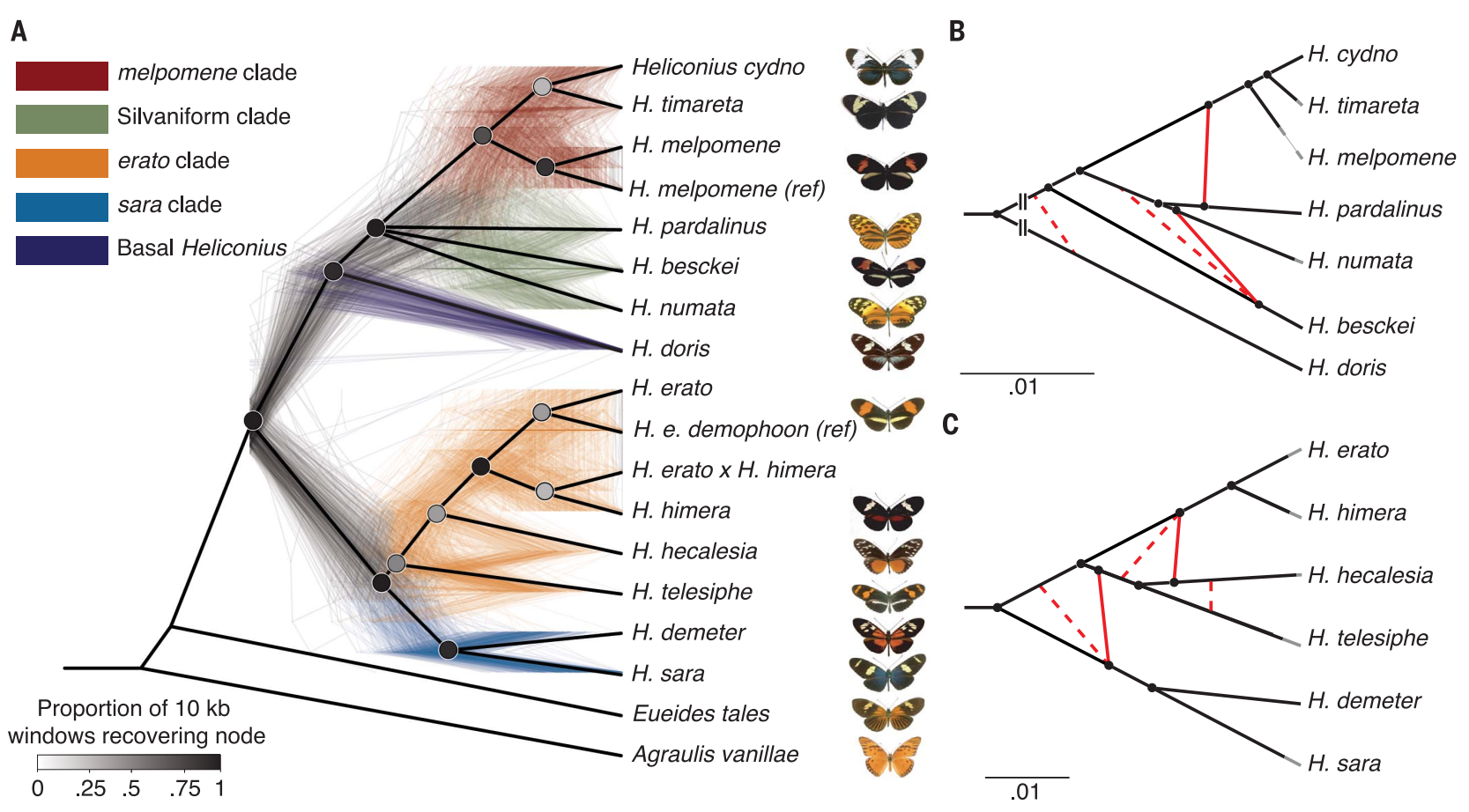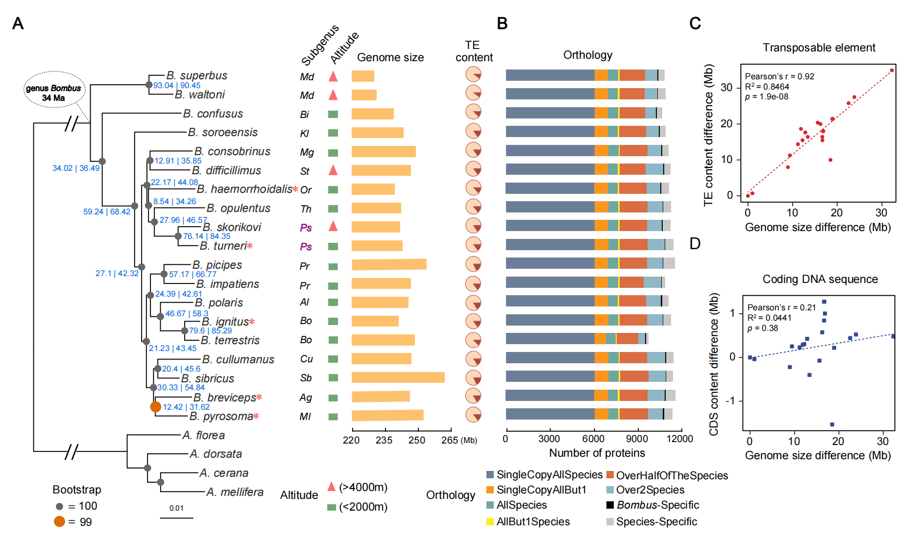 針對于同一個屬內(nèi)不同種之間的研究,由于其間親緣關(guān)系相對較近,基因組間相似度較高,往往是對其基因結(jié)構(gòu)特征差異、轉(zhuǎn)座子分析、屬內(nèi)分類研究、基因組間的基因漸滲現(xiàn)象、大型結(jié)構(gòu)變異挖掘、基因正選擇分析上進行。例如,作者通過構(gòu)建20個新的袖蝶屬基因組揭示基因滲入和不完全譜系分選的作用(Edelman N B et al.,Science.2020)、通過15個亞屬的17種熊蜂基因組確定了關(guān)鍵生態(tài)和取食偏好等行為特征相關(guān)的變異(Sun C et al.,Mol Biol Evol.2020)。