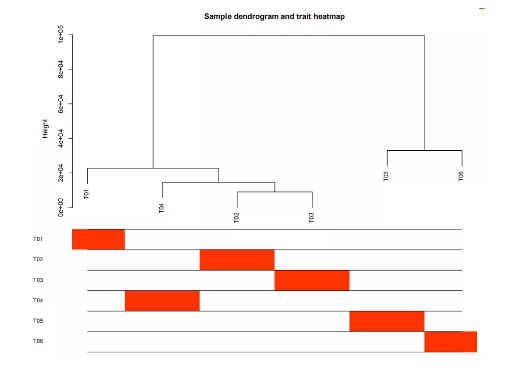 在基因表達(dá)量的樣本系統(tǒng)聚類樹的基礎(chǔ)上我們添加了熱圖,樣本與性狀之間的相關(guān)性越高熱圖中模塊顏色也會越深。例如我們將熱圖左邊的T01看作是性狀標(biāo)簽,它與分支樣本TP01的熱圖模塊呈現(xiàn)紅色,說明性狀T01與樣本T01的相關(guān)性非常高。