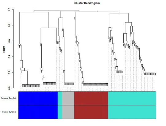 基因網(wǎng)絡(luò)模塊主要分為三個部分:第一部分為基因的聚類樹;第二部分為根據(jù)基因聚類樹劃分的不同模塊;第三部分為根據(jù)第二部分模塊進(jìn)行了矯正,最后結(jié)果為校正后的模塊。