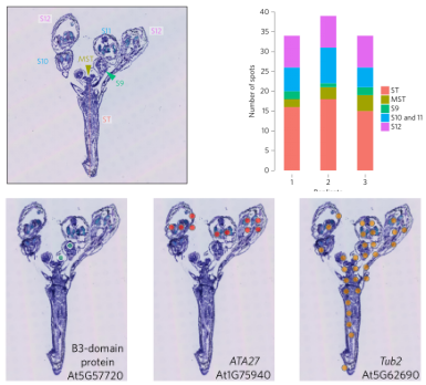 擬南芥花苞中空間轉(zhuǎn)錄組檢測莖、分生組織、以及3個不同花區(qū)域空間基因表達,一共檢測到20215個基因,鑒定開花有關(guān)的兩個關(guān)鍵基因At5g57720(已知的在S3和S9表達的基因)和 ATA27 (At1g75940,已知的在S11和S12表達的基因)的√確的空間定位可視化,組織區(qū)域特異性基因和通路的顯著差異,發(fā)現(xiàn)雄蕊絲發(fā)育通路在S11(雄蕊絲伸長的位置)和莖中富集,在莖中維管通道大量存在,并且細胞伸長和維管發(fā)育過程非?;钴S。其中花粉外壁形成途徑在S10和S11發(fā)生改變,在這個階段,外壁是花粉壁的主要組成部分之一,在絨氈層產(chǎn)生并沉積在花粉前細胞上??臻g基因表達特征揭示了組織區(qū)域異質(zhì)性,并為植物生長發(fā)育過程和相應(yīng)功能的探索提供了高分辨率的空間植物基因表達模式,從新的維度探索植物發(fā)育過程。