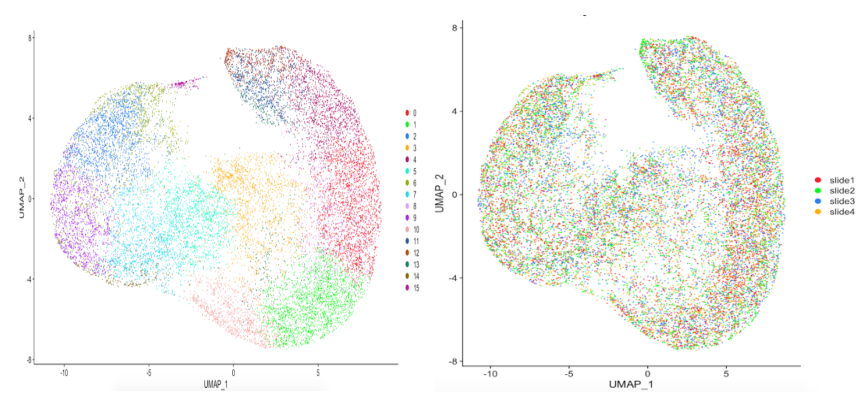 UMAP對樣本進行批次效應(yīng)分析,可視化展示16個樣本空間基因表達聚類可視化圖。