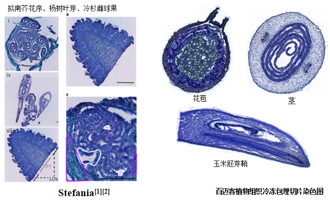 動物組織常用HE(蘇木精-伊紅染色法 ( hematoxylin-eosin staining ))染色,可以精準識別組織形態(tài)和病理學(xué)鑒定。然而植物的組織存在的纖維素和一些木質(zhì)素不適合HE染色方法,采取的是甲苯胺藍染色法,其基本原理是植物組織木質(zhì)化細胞壁呈藍綠色,其他組織成分呈紫藍色,可以精準輔助判斷植物組織形態(tài)學(xué)和確定捕獲區(qū)域。