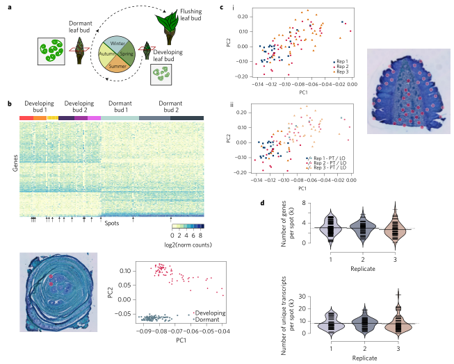 文中首先鑒定楊樹休眠期和發(fā)育期葉芽不同組織區(qū)域基因表達特征,證實了技術(shù)檢測的z確性、靈敏度以及重復(fù)性。休眠期(冬季)和發(fā)育期(夏季)葉芽一共檢測到17043個基因,樣本每個spot檢測到基因中位數(shù)為2929,轉(zhuǎn)錄本檢測中位數(shù)為8061,跟休眠期相比,在發(fā)育期葉芽中有408高表達的基因,在發(fā)育芽還是休眠芽組織切片中,高表達的基因在同一組切片之間和不同組的復(fù)制芽切片之間的表達模式清晰一致,無論生物學(xué)重復(fù)還是技術(shù)重復(fù)都證實該方法的重顯性和√確性。