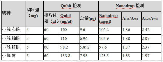 用Biomarker Micro Cell/Tissue DNA Kit試劑盒,提取5 mg的不同動(dòng)物組織中的DNA,然后檢測(cè)DNA的濃度以及完整性,具體數(shù)據(jù)如下: