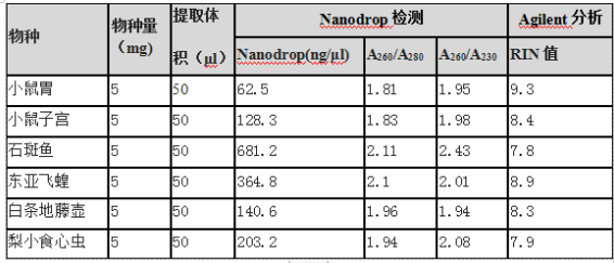 用百邁客試劑盒,提取5 mg的不同動(dòng)物組織中的RNA,然后檢測(cè)RNA的濃度以及完整性。結(jié)果如下: