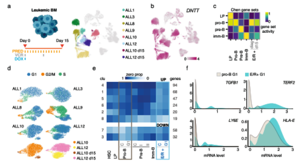 為了表征ALL(E/R)中常見的TF融合的白血病細胞,本研究對6個兒童E/R+ pre-B-ALL病例進行了scRNA-seq,收集6個診斷期和2個誘導(dǎo)化療第15天的BM樣本(圖 3a)?;贒NTT表達及其與正常BM細胞類型的明確分離,確定了每個供體中的白血病細胞簇(圖 3b)?;贐細胞譜系簇特異性基因集,發(fā)現(xiàn)診斷時白血病母細胞類似于pro-B分化狀態(tài)(圖 3c)。該分析同樣將pro-B細胞鑒定為*接近的正常分化狀態(tài),這與之前的研究一致。細胞周期狀態(tài)在不同情況下不同,ALL3中的循環(huán)細胞比例*低,ALL9中的*高比例(圖 3d)。對于具有中期誘導(dǎo)治療的2個病例(ALL10 和 ALL12),在第15天收集的樣本中細胞分離為不同的細胞狀態(tài)(圖 3a、d),表明治療進一步改變了白血病細胞狀態(tài)。