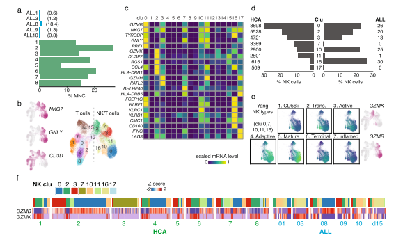 為了進一步表征免疫細胞群,將HCA和E/R+ ALL供體的T細胞和NK細胞匯集在一起進行聯(lián)合分析。基于聚類和marker基因分析,可以區(qū)分幾種不同的NK細胞類型(圖 4b、c)。篩選表達GNLY或NKG7的cluster(cluster 0、2、3、7、10、11、16),發(fā)現(xiàn)與來自HCA供體的NK細胞相比,來自ALL BM的NK細胞被隨機分配給這些cluster(圖 4d)。具體來說,所有NK細胞主要代表cluster 10和16,它們與表達未成熟CD56bright 和過渡NK細胞的顆粒酶 K(GZMK)相匹配(圖 4e 中的基因組評分代表來自scRNA-seq研究的NK亞型)。相比之下,大多數(shù)正常 BM NK細胞代表表達顆粒酶 B(GZMB)和穿孔素(PRF1)的成熟或終末NK細胞(cluster 0)。因此,E/R+白血病細胞可能會主動逃避NK細胞的細胞毒性,然而,NK類型的頻率因供體而異(圖 4f)。高表達IFNG的cluster 7幾乎完全對應(yīng)于HCA供體 3,而與其他ALL病例相比,細胞周期高度活躍的ALL8和ALL9更類似于正常BM中的成熟或活性NK細胞譜。總之,白血病細胞狀態(tài)與正常pro-B分化狀態(tài)的不同之處在于干/祖細胞特異性基因和幾種免疫調(diào)節(jié)基因的高表達。免疫調(diào)節(jié)基因的變化反映為E/R+ BM內(nèi)更多不成熟的NK細胞類型。