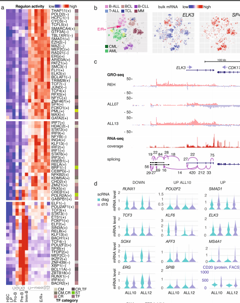 基于bulk RNA分析可以驗證它們在B-ALL中的表達,在E/R+亞型(紅色箭頭)中檢測到的比例*高,如在t-SNE圖上比較血液系統(tǒng)惡性腫瘤所示(圖 5b),其中惡性淋巴瘤在圖上突出顯示。兩種常見的B-ALL亞型(E/R+和高超二倍體病例)顯示出類似的高ELK3,而升高的SP4則更具 E/R 特異性,進一步分析了E/R+細胞中的這些TF基因座(圖 5c)。本研究使用GRO-seq對E/R+ BM中的新生轉(zhuǎn)錄進行了分析,揭示了Pol2參與編碼和非編碼區(qū)的主動起始和延伸。GRO-seq 證實了這些基因位點在 E/R+細胞中的轉(zhuǎn)錄活性(圖 5c)。此外,還揭示了ELK3上游未注釋(Refseq、UCSC 或 Gencode)的轉(zhuǎn)錄起始位點(TSS)(圖 5c)。兩個lncRNA庫在該基因組區(qū)域內(nèi)具有匹配的轉(zhuǎn)錄本,但注釋之間的一致性很差。因此,在E/R+ BM(n = 8,scRNA-seq 和 GRO-seq 分析中的匹配樣本)中使用配對的bulk RNA-seq 進一步檢測了該基因座內(nèi)的剪接模式。帶注釋的ELK3轉(zhuǎn)錄本具有來自剪接點跨越reads的支持,而上游轉(zhuǎn)錄本與lncRNA結(jié)構(gòu)*匹配(圖 5c)。