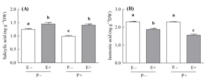 結(jié)果表明內(nèi)生真菌增加了植物SA濃度,與未接種病原菌的植株相比,內(nèi)生真菌增加了2倍的SA濃度(P+和P植物的內(nèi)生真菌分別使SA增加30%和14%)。與 SA 相反,內(nèi)生真菌降低了植株中JA濃度。接種病原菌的內(nèi)共真菌生植物與未接種的進(jìn)行比較,茉莉酸的濃度降低了2倍。內(nèi)生真菌導(dǎo)致JA 濃度的減少,對(duì)于 P+和 P-植物分別為 32% 和 18%;