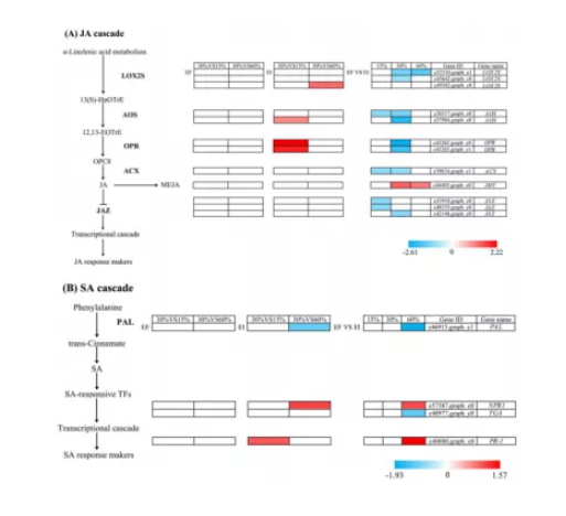 分析不同處理下,與JA和SA生物合成和反應(yīng)途徑相關(guān)的DEGs。發(fā)現(xiàn)了12個(gè)參與α-亞麻酸代謝和JA介導(dǎo)的信號(hào)通路的基因和4個(gè)參與苯丙氨酸和SA介導(dǎo)的信號(hào)通路的基因。JA和SA生物合成和反應(yīng)途徑的關(guān)鍵基因,如LOX2S、AOS、OPR、ACX、JMT、JAZ、PAL、NPR1、TGA和PR-1,表現(xiàn)出不同程度的上調(diào)或下調(diào)。