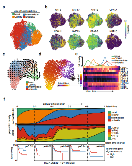 上皮細(xì)胞的無(wú)監(jiān)督聚類分為基礎(chǔ)、過(guò)渡和傘部類群(圖2a)。有趣的是CDH12群體與后一類典型群體明顯不同,而過(guò)渡群體的KRT13和KRT17表達(dá)水平最高(圖2b)。確定了一個(gè)始于基礎(chǔ)細(xì)胞的軌跡,隨后分化為兩種途徑:一種貫穿CDH12群體,一種跳過(guò)CDH12群體(圖2c和d)。關(guān)鍵的尿上皮分化標(biāo)記物沿著這條路徑跟蹤,在起始階段CD44高表達(dá),隨后中間是KRT13和KRT17,終點(diǎn)站為UPK1A、GATA3、PPARG(圖2e)。所有4個(gè)正常樣本的擬時(shí)序分析顯示出相似的路徑,CDH12群位于起始點(diǎn)附近(圖2f)。為了確定CDH12腫瘤細(xì)胞與正常腫瘤細(xì)胞之間的轉(zhuǎn)錄相似性,并推斷它們?cè)谡I掀ぜ?xì)胞分化軌跡上的位置,作者使用表達(dá)相似性,確定了每個(gè)MIBC上皮細(xì)胞中最接近的正常細(xì)胞,然后給腫瘤細(xì)胞分配相應(yīng)的正常潛伏期(圖2f)。值得注意的是,最未分化表型對(duì)應(yīng)的間隔得分預(yù)測(cè)了較差的疾病特異性生存(DSS),而最分化表型對(duì)應(yīng)的間隔得分預(yù)測(cè)了較好的DSS,中間的間隔得分顯示了相反結(jié)果之間的過(guò)渡(圖2f)。