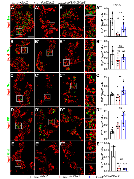 通過β-gal(lacZ等位基因的表達(dá))染色,觀察到Insm1delSNAG突變體的胰腺在E18.5時(shí)胰島素陽性β細(xì)胞數(shù)量減少,但是沒有像Insm1 null突變小鼠中那么嚴(yán)重(圖1A–A”’)。與對照相比,在Insm1delSNAG或Insm1中沒有觀察到α細(xì)胞數(shù)有變化(圖1B)。同時(shí)發(fā)現(xiàn)和對照相比,在Insm1delSNAG和Insm1-null突變體中觀察到PP數(shù)量的增加和δ細(xì)胞的減少(圖1D和E)。然而與對照小鼠相比,Insm1delSNAG突變體中生長抑素陽性的δ細(xì)胞數(shù)量顯著增加,且在Insm1-null突變體中細(xì)胞數(shù)減少了(圖1C–C”)。