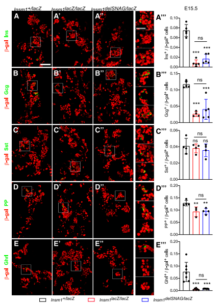 為了確認(rèn)這些減少現(xiàn)象是否發(fā)生在早期發(fā)育階段(即E15.5),檢測了胰腺E15.5的內(nèi)分泌系統(tǒng)。結(jié)果與對照相比,Insm1delSNAG和Insm1-null突變體中在觀察到一個(gè)類似的減少現(xiàn)象,包括胰島素,胰高血糖素,PP-和饑餓素陽性細(xì)胞(圖2)。然而,生長抑素陽性細(xì)胞的數(shù)量在Insm1delSNAG或Insm1-null突變體中都沒有發(fā)生改變(圖2C–C”)。因此,Insm1delSNAG突變體中δ細(xì)胞數(shù)量的增加發(fā)生在E18.5,而不在E15.5。