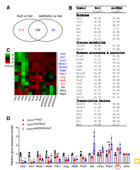 選用E18.5時(shí)Insm1delSNAG,Insm1 null和對照組小鼠的胰腺,利用RNA-seq研究Insm1delSNAG突變體胰臟內(nèi)的特異性基因表達(dá)。分析發(fā)現(xiàn)在Insm1delSNAG突變體胰腺中,共有231個(gè)基因顯著失調(diào),這些基因涉及發(fā)育和激素分泌方面。同時(shí)發(fā)現(xiàn)Insm1delSNAG和null 突變有顯著的差異基因交集,尤其是編碼激素的基因和與葡萄糖代謝和分泌調(diào)節(jié)相關(guān)的基因(圖5A、B)。Insm1delSNAG突變體中大約72.7%的差異基因也在Insm1 null突變體中被檢測到。然而與Insm1delSNAG突變體相比,Insm1 null突變體中有著更多的基因表達(dá)和數(shù)量上的變化。這些結(jié)果與在Insm1delSNAG突變體中發(fā)現(xiàn)比Insm1null突變體中β細(xì)胞更少這一現(xiàn)象一致。