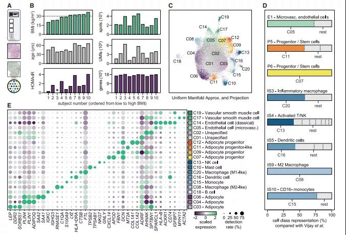 作者使用10x Genomics Visium平臺(tái)對(duì)?WAT中的細(xì)胞類型的異質(zhì)性和空間位置進(jìn)行了研究。通過穿刺活檢獲得體重指數(shù)、年齡和對(duì)胰島素敏感性均有差異的10個(gè)人的腹部皮下WAT樣本。對(duì)其覆蓋27,937個(gè)spots的數(shù)據(jù)進(jìn)行空間轉(zhuǎn)錄組分析,結(jié)果發(fā)現(xiàn)每個(gè)切片平均檢測(cè)17,303個(gè)獨(dú)特基因和3,280,607個(gè)UMIs(圖1B)。通過對(duì)數(shù)據(jù)進(jìn)一步分析,共鑒定了?20種不同的細(xì)胞類群(C01-C20;圖1C),且存在于所有捐助者中。接下來,將目前的結(jié)果與最近發(fā)表的人類WAT間質(zhì)血管的單細(xì)胞數(shù)據(jù)進(jìn)行整合分析?,結(jié)果表明,空間數(shù)據(jù)包含了內(nèi)皮細(xì)胞、免疫細(xì)胞和祖細(xì)胞的特定群體(圖1D)。人工注釋標(biāo)記基因協(xié)助作者對(duì)20類細(xì)胞類型進(jìn)行標(biāo)注(圖1E),主要包括免疫細(xì)胞(單核細(xì)胞[C15], Ml-like[C20]和 M2-like 巨噬細(xì)胞[C08],樹突細(xì)胞[C16],肥大細(xì)胞[C10], B細(xì)胞[C18]和NK細(xì)胞[C13]),血管細(xì)胞(微血管 [C05]和經(jīng)典[C14]內(nèi)皮細(xì)胞和血管平滑肌細(xì)胞[C17 / C19])和脂肪細(xì)胞祖細(xì)胞(C07 / C09 / C12)。在后者中,C07表達(dá)成熟的前脂肪細(xì)胞/脂肪干細(xì)胞標(biāo)記物,C09表達(dá)編碼纖維化和細(xì)胞外基質(zhì)蛋白的轉(zhuǎn)錄本,而C12是前兩者的混合。一個(gè)祖細(xì)胞類群(C11)富集了多個(gè)編碼金屬硫蛋白的基因,在立體分析中將其歸為祖細(xì)胞(圖1D)。然而,在UMAP中,它從其他三個(gè)祖細(xì)胞中分離出來,因此,作者確定了其特征基因在脂肪生成的整體轉(zhuǎn)錄譜和WAT的不同組分中的表達(dá)。這些分析證實(shí)了C11在脂肪祖細(xì)胞中富集,并在人類脂肪形成過程中瞬時(shí)表達(dá)。