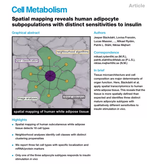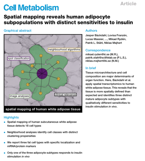 中文題目:空間圖譜揭示人類脂肪細(xì)胞亞群對(duì)胰島素有不同的敏感性 期刊名稱:Cell Metabolism