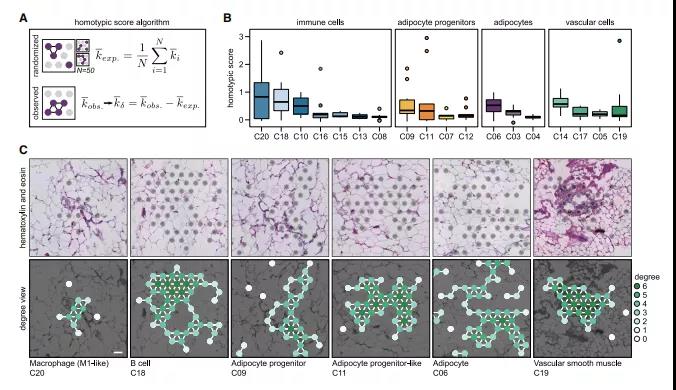? ? ? ?為了確定不同細(xì)胞類型之間的空間關(guān)系,作者還開發(fā)了一種算法對(duì)異型鄰域分析 (圖3A),揭示了幾種關(guān)聯(lián)性(圖3B,3C)。正如預(yù)期的那樣,較大血管結(jié)構(gòu) (C14/C17/C19)彼此之間的距離比與血管樣組織的距離更加靠近;M2-like巨噬細(xì)胞(C08)經(jīng)常位于兩種脂肪祖細(xì)胞附近:C09的同型簇(圖3C)和分散的C12,這與小鼠研究一致。此外,樹突狀細(xì)胞(C16)與其他免疫細(xì)胞表現(xiàn)出較高的異型評(píng)分,而兩類成熟脂肪細(xì)胞(C03/C04)相互共定位,并與C06脂肪細(xì)胞明顯分離??傊愋袜徲蚍治霰砻?,WAT的空間定義比預(yù)期的更明確,具有特定的細(xì)胞-細(xì)胞關(guān)系。
