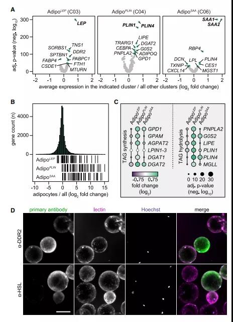 ? ? ? ? ? ?作者的分析確定了三種不同類型的成熟脂肪細(xì)胞,它們具有不同的轉(zhuǎn)錄譜和空間排列。作者進(jìn)一步定義了每個(gè)亞型的標(biāo)記基因(圖4A),結(jié)果發(fā)現(xiàn)了LEP(編碼脂肪因子瘦素)、PLIN1/PLIN4(編碼脂滴蛋白perilipin-1和-4)和SAA1/SAA2(編碼血清淀粉樣蛋白A1和A2急性期蛋白質(zhì))是各分類中最獨(dú)特的基因。因此,作者將這些亞群體命名為Adipo LEP、Adipo PLIN和Adipo SAA。如結(jié)果所示,Adipo LEP富集了細(xì)胞-細(xì)胞/基質(zhì)細(xì)胞相互作用蛋白和瘦素信號(hào)/分泌調(diào)節(jié)基因。AdipoPLIN標(biāo)記基因與葡萄糖和脂質(zhì)代謝以及脂肪因子脂聯(lián)素相關(guān)。雖然Adipo SAA與Adipo PLIN有一些共同的標(biāo)記基因,但這類基因也富集了多種與視黃醇代謝及結(jié)合的多種脂肪因子和酶。為了證實(shí)這三種亞型的標(biāo)記基因在成熟脂肪細(xì)胞中表達(dá),作者分析了大量配對(duì)樣本的轉(zhuǎn)錄組學(xué)數(shù)據(jù),比較了從WAT中分離的脂肪細(xì)胞和非脂肪細(xì)胞。相關(guān)數(shù)據(jù)表明,50個(gè)標(biāo)記基因在脂肪細(xì)胞中富集(圖4B),說明Adipo LEP、AdipPLIN和AdipoSAA代表不同類型的脂肪細(xì)胞??臻g數(shù)據(jù)的進(jìn)一步分析顯示,這些亞型表現(xiàn)出相互的表達(dá)模式(圖4C)。作者用針對(duì)AdipoLEP(DDR2)和Adipo PLIN (HSL,由LIPE編碼)標(biāo)記蛋白的抗體對(duì)從人皮下WAT分離的成熟脂肪細(xì)胞進(jìn)行染色,驗(yàn)證了該結(jié)果(圖4D)。此外,還使用針對(duì)CD36(Adipo PLIN的標(biāo)記物)和 CSDEl(Adipo LEP的標(biāo)記物)的抗體對(duì)人類成熟脂肪細(xì)胞進(jìn)行了免疫共標(biāo)記,觀察到其相互的染色模式。對(duì)于Adipo SAA,作者進(jìn)行了多種抗體的測(cè)試,但沒有一種抗體顯示出足夠的特異性。綜上所述,空間數(shù)據(jù)可在蛋白質(zhì)水平上進(jìn)行概述,并支持所鑒定的脂肪細(xì)胞具有不同表達(dá)譜的亞群。