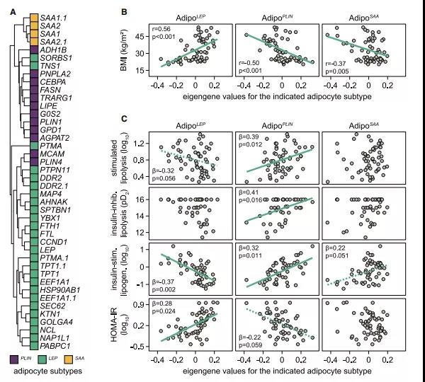 ? ? ? ??接下來,作者的目標(biāo)是了解脂肪細(xì)胞亞型對(duì)組織功能的貢獻(xiàn)。為深入了解脂肪細(xì)胞亞型方面的功能,作者對(duì)56女性的WAT轉(zhuǎn)錄組數(shù)據(jù)進(jìn)行了綜合分析,其中還對(duì)新鮮分離的脂肪細(xì)胞進(jìn)行了脂肪分解/脂肪生成測(cè)量。在比較56名女性數(shù)據(jù)時(shí),Adipo PLIN、Adipo LEP和Adipo SAA標(biāo)記基因形成了單獨(dú)的、共同調(diào)控的集群(圖6A),可用來確定細(xì)胞類型豐度和脂肪細(xì)胞表型之間的關(guān)系。與空間數(shù)據(jù)一致 ,Adipo PLIN在肥胖人群中的比例降低,分析顯示Adipo PLIN與BMI之間負(fù)相關(guān),AdipoSAA與BMI也呈負(fù)相關(guān),而AdipoLEP呈正相關(guān)(圖6B)。