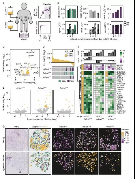 ? ? ? ??在脂肪細(xì)胞中,兒茶酚胺刺激脂肪分解,胰島素抑制脂肪分解促進(jìn)脂肪生成。通過校正BMI(圖6c),作者觀察到AdipoPLIN和兩種脂解指標(biāo)之間存在正相關(guān),而AdipoLEP與這些參數(shù)沒有或弱負(fù)相關(guān)。對(duì)于胰島素刺激脂肪生成,研究發(fā)現(xiàn)Adipo PLIN與此指標(biāo)呈正相關(guān),AdipoLEP呈負(fù)相關(guān)。相比之下,AdipoSAA與任何研究參數(shù)均無顯著相關(guān)性??傊@表明Adipo PLIN與AdipoSAA相比,Adipo PLIN與更明顯的胰島素反應(yīng)有關(guān)。為了在人體內(nèi)測(cè)試這一發(fā)現(xiàn),作者在高胰島素-微生物-正血糖鉗夾2小時(shí)后,從10個(gè)個(gè)體中的4個(gè)收集了 WAT樣本,并進(jìn)行了空間轉(zhuǎn)錄組分析(圖7A,7B)。穩(wěn)定狀態(tài)下的胰島素平均濃度是空腹?fàn)顟B(tài)下的10倍,從葡萄糖處理率(m值)可以看出,4例患者均表現(xiàn)出明顯的胰島素敏感性(圖7B)。高胰島素血癥的空間數(shù)據(jù)與禁食狀態(tài)下獲得的樣本質(zhì)量相似(圖7B),兩者的比較在基因表達(dá)水平上明確了胰島素反應(yīng)(圖7C)。這些數(shù)據(jù)與之前報(bào)道的高胰島素鉗夾隊(duì)列的大量組織RNA測(cè)序顯示出一致的結(jié)果,表明空間分析捕捉到了胰島素的急性反應(yīng)。盡管胰島素誘導(dǎo)了一個(gè)快速的轉(zhuǎn)錄反應(yīng),但在這個(gè)時(shí)間框架內(nèi),它本身并不是脂肪細(xì)胞異質(zhì)性的驅(qū)動(dòng)因素(圖7D)。接下來,作者根據(jù)細(xì)胞類型進(jìn)行胰島素反應(yīng)分析。對(duì)于脂肪細(xì)胞,在AdipoPLIN中有多個(gè)基因?qū)σ葝u素有顯著反應(yīng),AdipoSAA中變少,而AdipoLEP中只有一個(gè)基因(圖7E)。作者評(píng)估了個(gè)體間對(duì)胰島素的轉(zhuǎn)錄反應(yīng)是否存在數(shù)量差異,分析結(jié)果表明,Adipo PLIN反映了 M-values值,但這在其他兩個(gè)亞型中不明顯(圖7F和7G)??傊@些數(shù)據(jù)表明,體內(nèi)對(duì)胰島素的轉(zhuǎn)錄反應(yīng)主要?dú)w因于Adipo PLIN,而其他脂肪細(xì)胞亞型對(duì)高胰島素血癥仍然沒有反應(yīng)。