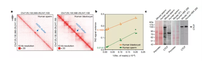 圖a 人類精子,人類胚胎和H1人類ES細(xì)胞(hESCs)中高階染色質(zhì)結(jié)構(gòu)相互作用熱圖,分辨率為40 kb(合并的生物學(xué)重復(fù);n = 2-3)。