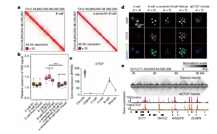 接下來(lái),作者旨在鑒定ZGA期間參與TAD建立的蛋白質(zhì)。粘著蛋白復(fù)合物和CTCF在高階染色體結(jié)構(gòu)中具有重要作用。因此,作者研究了這些蛋白質(zhì)表達(dá)的差異。粘附蛋白復(fù)合物的亞基,例如RAD21,已經(jīng)在ZGA之前在人類胚胎中高度表達(dá)。相比之下,當(dāng)在人類胚胎中首次觀察到TAD結(jié)構(gòu)時(shí),CTCF的表達(dá)在ZGA階段之前非常有限,并且在8細(xì)胞階段急劇增加(圖4c)。在經(jīng)α-amanitin處理的8細(xì)胞胚胎中,CTCF表達(dá)受到抑制。一致地,免疫染色圖像顯示在2細(xì)胞核中幾乎未觀察到CTCF蛋白(圖4d)。CTCF明顯存在于未經(jīng)處理的8細(xì)胞核中,但在經(jīng)α-amanitin處理的8細(xì)胞核中卻不存在(圖4d)。這些結(jié)果表明CTCF表達(dá)需要人ZGA。