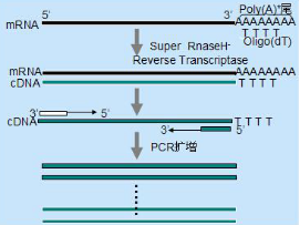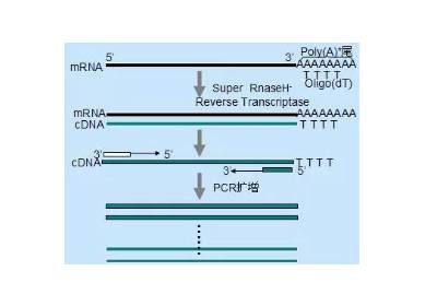 逆轉(zhuǎn)錄(Reverse Transcription)是以RNA為模板,在逆轉(zhuǎn)錄酶的催化作用下,合成RNA/DNA雜合雙鏈,然后水解雜合雙鏈中的RNA,得到互補的單鏈cDNA的過程。得到的cDNA單鏈可以作為擴增模板,合成雙鏈DNA。cDNA的合成可以用與后續(xù)的PCR實驗、qpcr實驗、基因檢測、基因工程等各個領(lǐng)域。