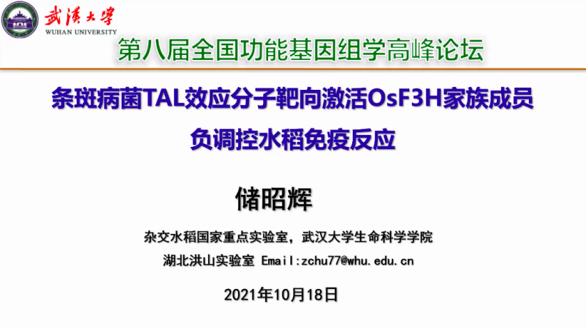 武漢大學(xué)生命科學(xué)學(xué)院儲昭輝教授報告了其團(tuán)隊在水稻和條斑病菌互作上的研究進(jìn)展,講解了HGA4菌株致病力更強的原因是其比RS105菌株包含更多TAL效應(yīng)因子,并且表明Tal2b、Tal2c是兩個致病因子,它們通過分別靶向調(diào)控水稻中OsF3H03g、OsF3H04g基因進(jìn)而調(diào)控水稻對條斑病的抗性,最后展示了對其進(jìn)行的一系列功能驗證與分子機制研究。