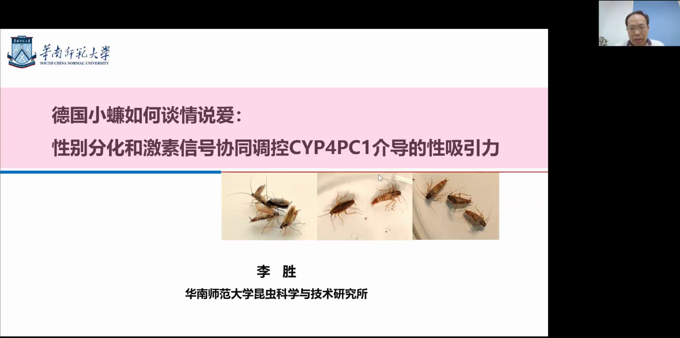 華南師范大學(xué)李勝教授風(fēng)趣的為我們介紹了德國小蠊性激素調(diào)控相關(guān)研究。研究團(tuán)隊通過轉(zhuǎn)錄組及相關(guān)驗證實驗,在觸角中找尋到雄蟲中表達(dá)量高于雌蟲基因的CYP4PC1基因,該基因可能是控制信息素合成的關(guān)鍵基因。通過基因敲除的方式進(jìn)一步從表型中驗證了CYP4PC1在信息素的產(chǎn)生和求偶的過程中具有重要的作用。后續(xù)研究表明,性別分化基因控制性二型CYP4PC1表達(dá)與調(diào)控,性別分化和激素信號協(xié)同調(diào)控CYP4PC1性吸引力,并使得小蠊成熟時只有一種性別具有性吸引力。最后李教授表明,通過性別分化和激素信號協(xié)同調(diào)控性吸引力可能在昆蟲和哺乳動物中普遍存在。