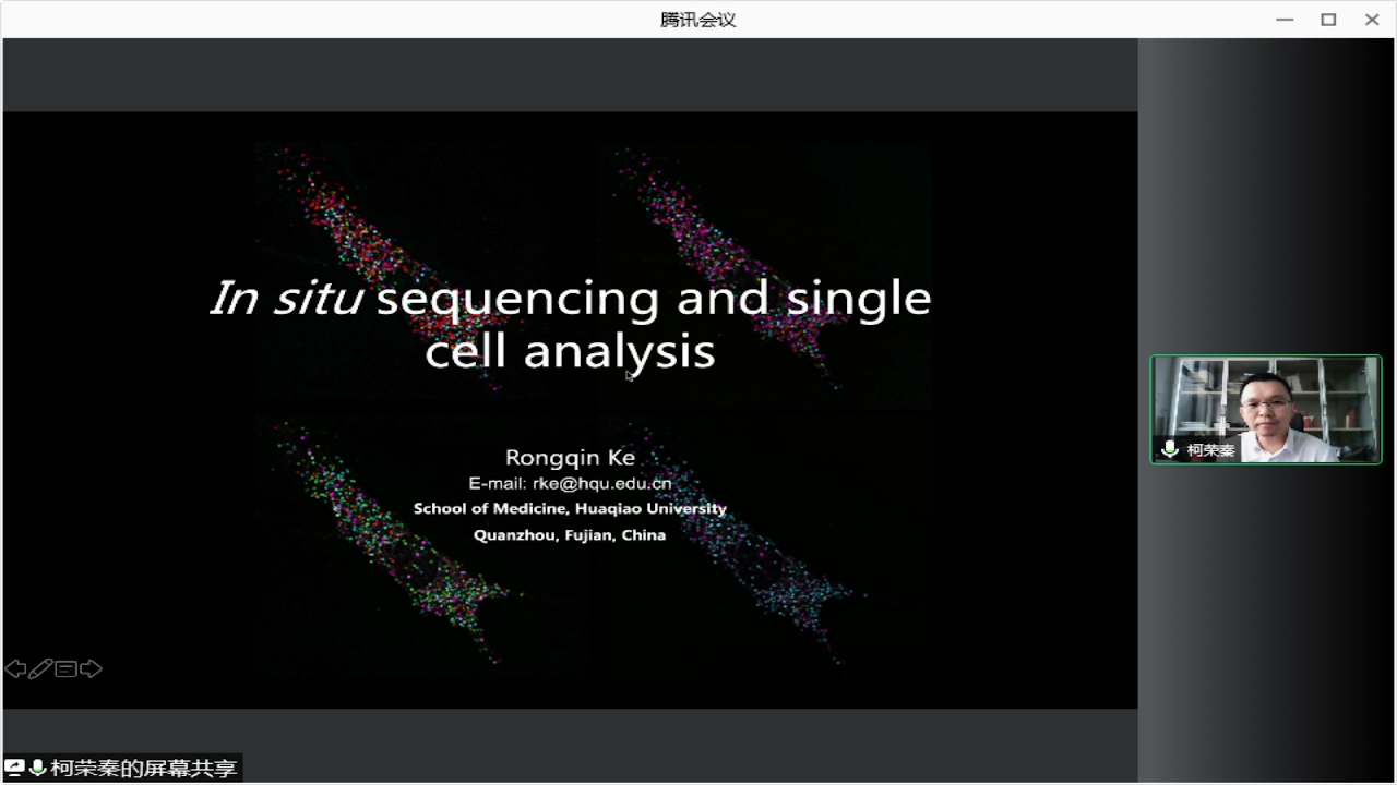 午后休息結(jié)束,華僑大學(xué)醫(yī)學(xué)院柯榮秦教授帶來的報(bào)告是:原位測序技術(shù)與單細(xì)胞分析。基于單細(xì)胞測序的基因表達(dá)分析需要將單個(gè)細(xì)胞從組織中分離出來,這個(gè)過程使所分析的單細(xì)胞丟失了空間位置信息??吕蠋焾F(tuán)隊(duì)開發(fā)了原位測序(in situ sequencing, ISS),是一種基于成像的空間轉(zhuǎn)錄組學(xué)技術(shù)。該技術(shù)可以在細(xì)胞甚至亞細(xì)胞分辨率下提供低通量到高通量的空間基因表達(dá)信息,將ISS技術(shù)應(yīng)用于癌癥組織中基因表達(dá)異質(zhì)性的可視化分析,并將之應(yīng)用于人腦組織單細(xì)胞測序所獲得的感興趣的基因的定位以補(bǔ)充其失去的空間位置信息。此外,還開發(fā)了一系列新型的具有更高的檢測靈敏度和更好的分辨率的單分子RNA原位雜交方法,可以在細(xì)胞和組織中對(duì)感興趣的RNA轉(zhuǎn)錄本進(jìn)行原位成像分析。我們相信我們所開發(fā)的原位RNA表達(dá)分析技術(shù)具有廣泛地用于生物和醫(yī)學(xué)的研究的潛力。