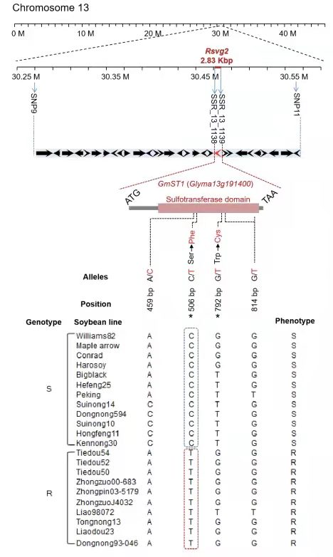大豆[Glycine max(L.)Merr。]是一種在世界范圍內(nèi)種植的重要油料作物,是人類豐富的植物油和蛋白質(zhì)來源。但許多病原體優(yōu)先攻擊大豆。這些攻擊導(dǎo)致嚴(yán)重的產(chǎn)量損失和質(zhì)量下降。在全世界攻擊大豆的病原體中,大豆花葉病毒(SMV)是通過蚜蟲和感染的種子非持久性傳播的,是最廣泛和破壞性最大的疾病之一。SMV感染通常會使大豆產(chǎn)量降低10–30%,但在嚴(yán)重暴發(fā)時,損失可能達(dá)到50–100%。根據(jù)大豆品種中SMV感染的癥狀,包括典型的葉片圖案,葉片變形,植物發(fā)育不良,頂部壞死和種子斑點,將SMV菌株分為7種主要致病型:G1-G7。由于種子的可傳播性,所有主要大豆生產(chǎn)國都存在菌株致病型(G1-G7)。目前,有4個主要的SMV抗性基因座(Rsv1,Rsv3,Rsv4和Rsv5),大豆基因組的可用性加快了分子標(biāo)記的開發(fā)和Rsv基因座候選基因的鑒定。最主要的Rsv1基因座是最復(fù)雜的,它包含編碼NBS-LRR蛋白的基因簇,這個染色體區(qū)域還攜帶多種病原體抗性基因,一大類同源NBS-LRR序列聚集在Rsv1基因座上,據(jù)推測,DNA的兩個片段分別是3gG2(Glyma.13g190800的等位基因)和5gG3(Glyma.13g190000的等位基因),是Rsv1的最可能的候選基因,針對Rsv3,Rsv4也進(jìn)行了相關(guān)的研究。盡管針對每個Rsv基因座篩選了候選基因,但除了Rsv4以外,沒有一個關(guān)鍵基因被完全闡明。本研究中使用重組自交系RIL群體和F2分離群體,確定并精細(xì)繪制了SMV抗性基因座Rsvg2;分離候選基因的同時,使用表達(dá)分析和遺傳轉(zhuǎn)化測定法驗證了其功能。最終發(fā)現(xiàn),Rsvg2編碼磺基轉(zhuǎn)移酶(SOT),GmST1,與AtSOT15(AT5G07010)同源,為大豆對SMV的抗性提供了新的可能解釋。
