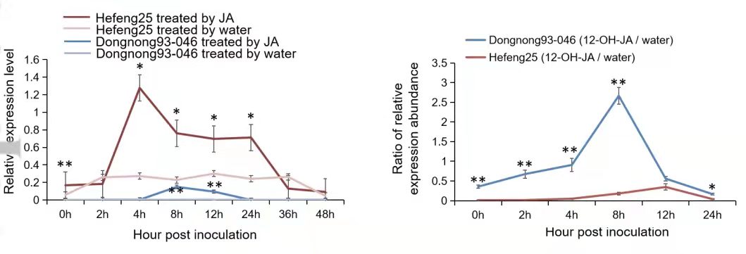 研究中為了證明在RSVG2-S等位基因和RSVG2-R等位基因之間,GmST1對SMV應(yīng)答的功能機(jī)制有所不同,且可能與JA信號通路相關(guān)(圖4),進(jìn)一步關(guān)注了RSVG2-R等位基因攜帶者(Dongnong93-046與轉(zhuǎn)基因株系OE2-18)和RSVG2-S等位基因載體(Hefeng25)JA含量的轉(zhuǎn)錄本的變化,結(jié)果表明,內(nèi)源性JA對SMV G2菌株有響應(yīng),且響應(yīng)程度在GmST1的不同單倍型之間發(fā)生變化。最后基于RNA-seq數(shù)據(jù),通過轉(zhuǎn)基因與非轉(zhuǎn)基因植株的比對,對JA信號通路相關(guān)基因進(jìn)行研究,結(jié)果表明,在SMV G2菌株感染下,JA的合成和代謝在RSVG2-R等位基因攜帶者中比在RSVG2-S等位基因攜帶者中更活躍,作為JA信號傳導(dǎo)途徑中的受體蛋白編碼基因,JAZ在具有不同GmST1等位基因的大豆品系之間具有差異表達(dá),說明JA途徑是由SMV感染誘導(dǎo)的,且GmST1介導(dǎo)的SMV抗性可能取決于JA防御反應(yīng)。
