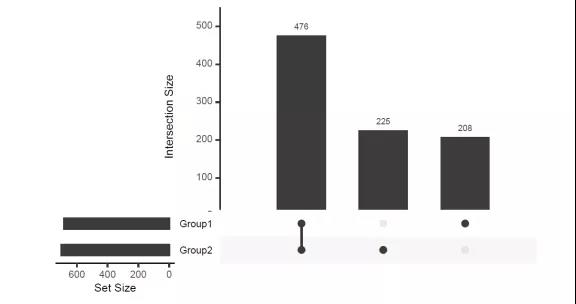 圖1. upset示例,展示Group1/Group2兩組組間共有和特有元素的數(shù)量
