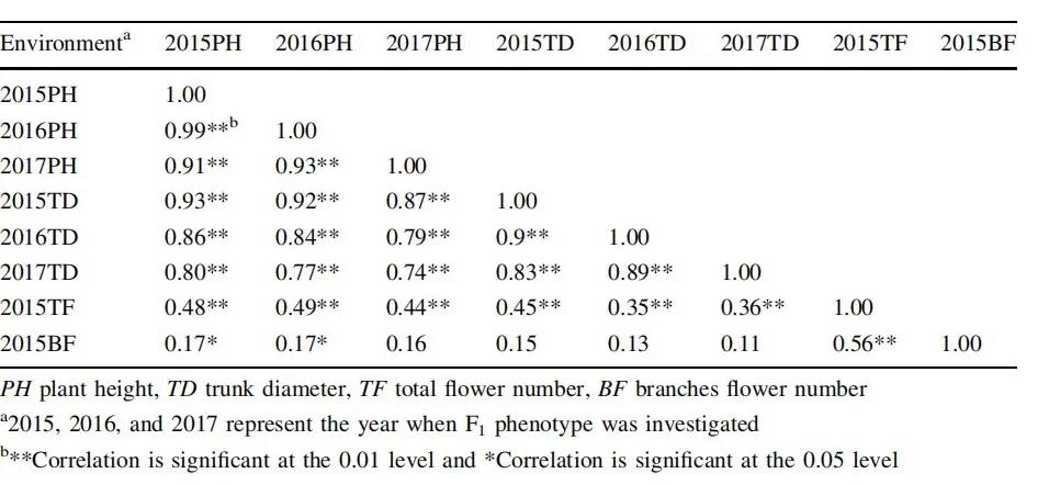 在2015-2017年,對F1群體的4個表型性狀進(jìn)行了評估,其中,PH是通過用尺子測量從地面到樹冠頂部的方式來調(diào)查;TD是記錄移接處上方10cm的直徑;TF和BF是計算總花數(shù)和分支花數(shù)。此外,相關(guān)性分析顯示,PH和TD呈顯著正相關(guān)(r>0.74, p<0.01)。