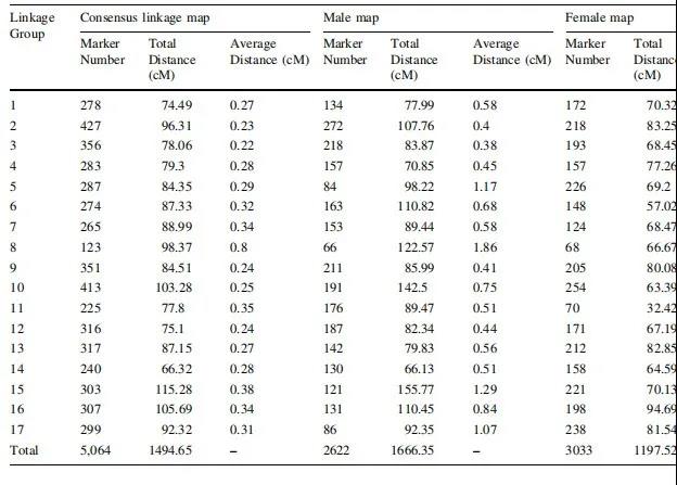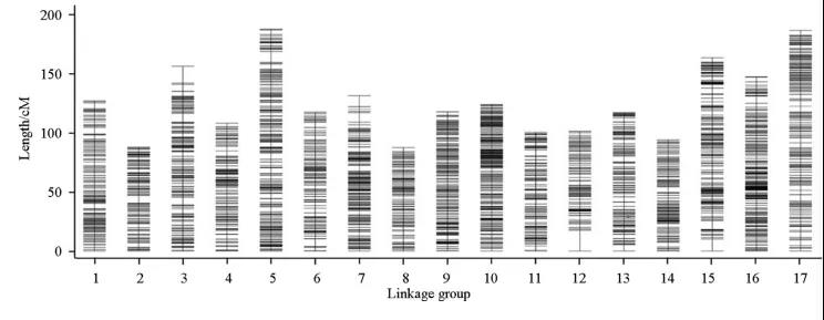 最后,利用HighMap將5113個高質(zhì)量SLAF標(biāo)記用于遺傳圖譜構(gòu)建,其中,雌性圖譜包含2622個SLAF標(biāo)記,總圖距1666.35cM。雄性圖譜包含3033個SLAF標(biāo)記,總圖距為1197.52cM。中性圖譜包含5064個SLAF標(biāo)記,形成17條連鎖群,總圖距為1494.65cM,平均圖距為0.36cM。在該圖譜中,有189個SLAF標(biāo)記在11個連鎖群中存在偏分離,包含112個SLAF標(biāo)記的LG7標(biāo)記偏分離率*高。在LG1、LG2、LG3、LG6、LG12和LG16中均未出現(xiàn)偏分離現(xiàn)象。并對以上圖譜進(jìn)行了單體來源評估、熱圖評估和共線性評估,結(jié)果表明該圖譜是高質(zhì)量的評估遺傳圖譜。