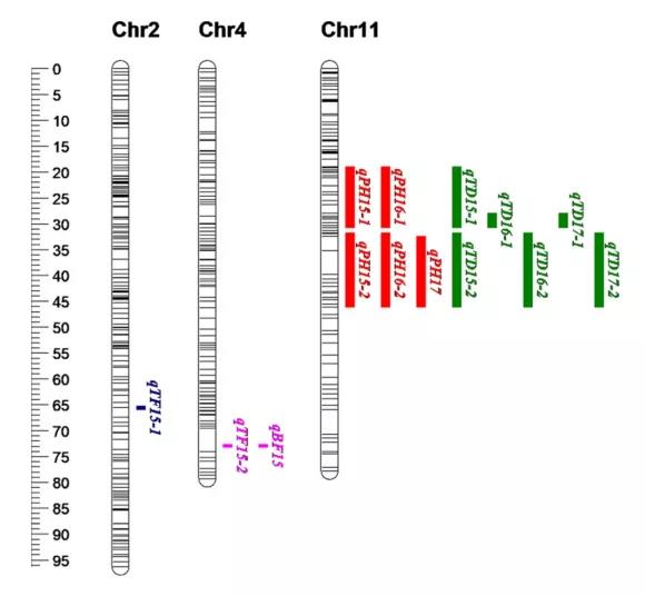 為了檢測F1群體中與4個性狀相關(guān)的位點(diǎn),對其進(jìn)行QTL分析。對于PH,結(jié)合3年的表型,在11號染色體上共鑒定到5個QTLs(qPH15-1, qPH16-1, qPH15-2, qPH16-2和qPH17),這些QTLs對表型變異的解釋范圍為17.20% ~ 22.40%。對于TD,共定位到6個QTLs(qTD15-1, qTD16-1, qTD17-1, qTD15-2, qTD16-2和qTD17-2),均位于11號染色體上,對表型變異解釋范圍為14.00~20.80%,PH與TD定位結(jié)果相重疊,均位于兩個QTL簇,該結(jié)果進(jìn)一步證實了PH和TD在表型上呈顯著正相關(guān)。對TF,定位到2個QTLs(qTF15-1和qTF15-2),分別位于2和4號染色體上,解釋表型變異率分別為8.80%和9.20%;另外,還定位到1個BF相關(guān)的QTL qBF15,可以解釋34.80%的表型變異。qTF15-2和qBF15在4號染色體被定位到同一個染色體區(qū)間內(nèi)。