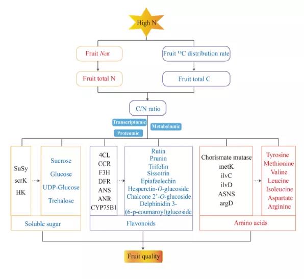 在中國,過量施用氮肥已成為一種普遍現(xiàn)象,蘋果樹種植中施氮量已達600?800 kg/hm2,遠遠超過蘋果樹的需求。雖然高氮對提高產(chǎn)量和單果重有積極作用,但過量的氮會影響C?N平衡,對可溶性糖、類黃酮等果實品質(zhì)指標產(chǎn)生負面影響。以往的研究主要集中在氮脅迫對蘋果葉片的影響上,而高氮對蘋果果實初級代謝和次級代謝影響的研究相對較少。本研究通過轉(zhuǎn)錄組學、蛋白質(zhì)組學和廣靶代謝組學的聯(lián)合分析,探索過量氮營養(yǎng)與初級和次級代謝物積累之間的關(guān)系,特別是C-N平衡中碳水化合物、氨基酸和黃酮類化合物的變化,并為提高蘋果果實品質(zhì)提供新的見解。