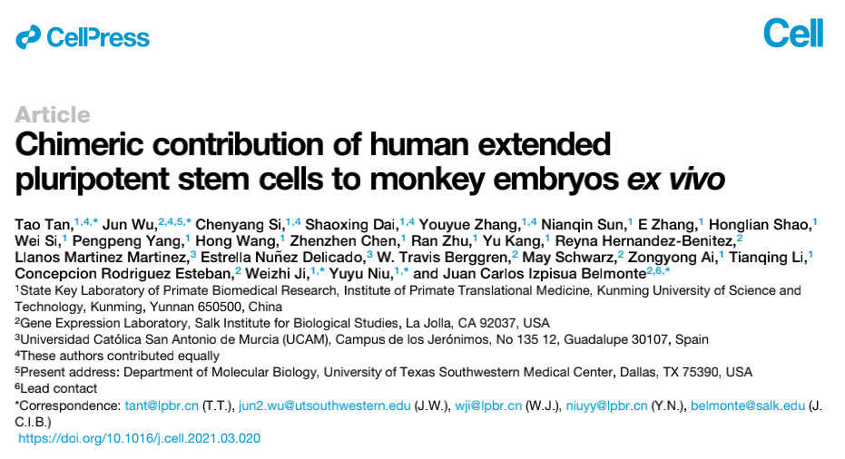 用人多能干細胞(hPSC)形成種間嵌合體已成為在體內(nèi)評估hPSC多能性的有效方案,并且 可能在再生醫(yī)學,包括移植器官和組織再生中發(fā)揮重要作用。使用小鼠和豬胚胎的研究表明, hPSCs并不能有力地促進與人類進化距離較遠的物種的嵌合體形成。本研究主要是在體外培養(yǎng)的 食蟹猴(Macaca fascicularis)胚胎中研究人擴展多能干細胞(hEPSC)的嵌合能力,證明 hEPSCs能夠在食蟹猴胚胎中存活、增殖,并繪制植入前后細胞圖譜。同時還發(fā)現(xiàn)了種間細胞相 互作用,這些事件可能有助于塑造嵌合胚胎內(nèi)人類和食蟹猴細胞的獨特發(fā)育軌跡。本研究結(jié)果 可能有助于更好地了解早期人類胚胎發(fā)育和靈長類動物進化,并制定策略以改善進化距離較遠 的物種的人類嵌合體的形成。