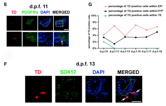 為研究食蟹猴胚胎中hEPSC的發(fā)育潛力,本研究使用幾種胚胎和胚胎外譜系特異性抗體進 行了免疫熒光(IF)研究。在圍植入期(d.p.f.9),平均有10.2±7.2(n = 9)個iPS1-EPSCs被 發(fā)現(xiàn)(在NANOG+或OCT4+食蟹猴細胞內(nèi)或附近發(fā)現(xiàn)TD+ OCT4+細胞)(圖 2A)。盡管這些 細胞表達OCT4,但只有少數(shù)細胞表達NANOG(圖 S1C),沒有在這些細胞中觀察到GATA6 表達(一種下胚層【HYP】標記)(圖 S1C)。 此外,還檢測到TD+GATA4+ HYP-like細胞 (圖 2B)。與小鼠中報道的結(jié)果相反(Yang et al., 2017),在食蟹猴囊胚的滋養(yǎng)外胚層 (TE)層中僅檢測到少數(shù)iPS1-EPSC表達了TE標記基因(例如TFAP2C和CK7)(圖 2C)。 在d.p.f.11時,食蟹猴胚胎的EPI層也檢測到TD+OCT4+細胞,這些細胞很少表達原腸胚形成標志物T+(也稱為Brachyury)。相比之下,在胚胎的背側(cè)羊膜處檢測到T+食蟹猴細胞(圖 2D)。此外,在食蟹猴HYP細胞內(nèi)發(fā)現(xiàn)表達HYP標志物、血小板衍生生長因子受體-α (PDGFRα)的TD+人類細胞(圖 2E)。在EPI層外發(fā)現(xiàn)了表達COL6A1的OCT4+人類細胞, COL6A1是胚胎外間充質(zhì)細胞(EXMC)的標志物,表明hEPSC正在向EXMC分化(圖 S1D)。在 d.p.f.13時,EPI層下方檢測到hEPSCs并表達內(nèi)胚層標記物SOX17,表明它們已啟動 原腸胚形成(圖 2F)。有趣的是,本研究發(fā)現(xiàn)從d.p.f.13開始,人類細胞傾向于聚集在一起并 與食蟹猴EPI層分離,通過檢測OTX2和OCT4的表達,發(fā)現(xiàn)這些人類細胞似乎已分化為原腸細 胞(Martyn et al., 2018; Vincent et al., 2003)(圖 S1E)??偟膩碚f,hEPSCs對EPI的貢獻較高 (在d.p.f.15時的最高貢獻值為7.08%),對HYP的貢獻相對較低(在d.p.f.19時的最高貢獻為 4.96%)(圖 2G)。