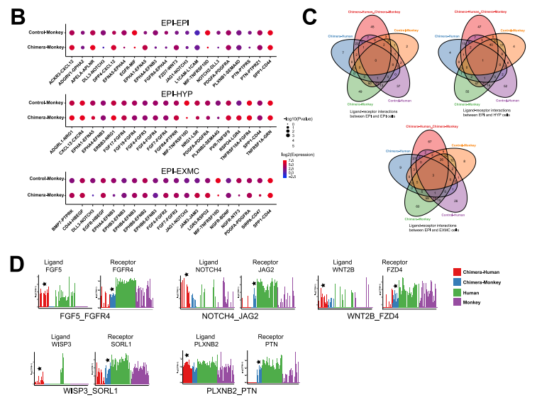 使用CellPhoneDB(v2.0.1)基于配體-受體對,分析不同胚胎譜系中人和猴細胞之間的信號 傳遞(Vento-Tormo et al., 2018)。CellPhoneDB中所有配體-受體相互作用數(shù)據(jù)庫都用于本次數(shù) 據(jù)分析。將所有嵌合細胞的表達譜及其信息,包括細胞類型(人類或猴細胞)和譜系信息 (EPI、HYP 和 EXMC)輸入 CellPhoneDB,以推斷兩種類型細胞之間的潛在相互作用。使用校 正后的P<0.05作為閾值來識別兩種類型細胞之間特異性表達的配體/受體,其他參數(shù)設置為默認 值。為了進行比較,上述數(shù)據(jù)集Human-1和monkey-1也進行相同分析。