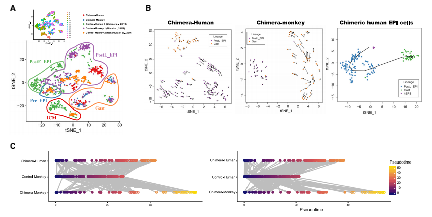 本研究結(jié)果初步證實了胚胎發(fā)育早期人類和猴細胞混合時發(fā)生的細胞和分子事件,結(jié)果揭示了靈長類動物胚胎發(fā)生過程中的進化趨同和發(fā)散的過程。這一系列基礎研究將有助于改善進 化距離更遠的物種的人類嵌合現(xiàn)象,出于各種原因,包括社會、經(jīng)濟和倫理,這些物種可能更 適合再生醫(yī)學轉(zhuǎn)化療法。