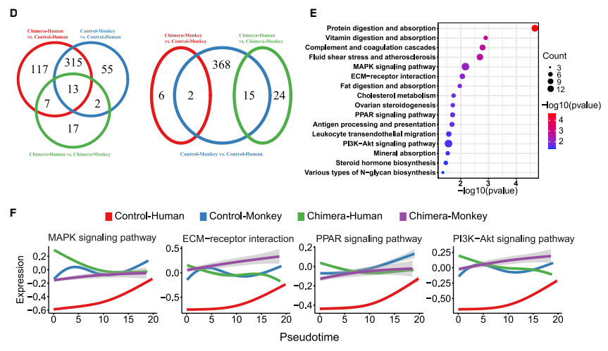 由于食蟹猴的細胞在人類細胞存在下表現(xiàn)出轉(zhuǎn)錄組的變化,接下來分析了嵌合胚胎中食蟹 猴細胞的發(fā)育動態(tài)。首先確定了嵌合猴胚胎和對照猴胚胎之間的差異表達基因(DEG)。EPI 細胞、HYP細胞和EXMCs細胞與對照胚胎相比,嵌合體細胞中分別有424、7和241個基因下 調(diào),5、2 和13個基因上調(diào)(圖 4D 和 S3A)。GO和KEGG富集分析確定了在嵌合猴EPI細胞、 HYP細胞和EXMCs細胞中上調(diào)和下調(diào)基因的信號通路,如Hippo和轉(zhuǎn)化生長因子β(TGF-β) 信號通路分別在嵌合猴EPI細胞和EXMCs細胞中下調(diào)(圖 4E)。 已經(jīng)證明食蟹猴EPI細胞的轉(zhuǎn)錄組譜在嵌合胚胎中發(fā)生了改變,接下來研究了食蟹猴EPI胚 胎生態(tài)位是否也受到人類細胞的影響。CellPhoneDB(v2.0.1)(Vento-Tormo et al., 2018)可 鑒定嵌合胚胎和對照胚胎中EPI和其他譜系(HYP 和 EXMCs)之間細胞的潛在相互作用。結(jié)果發(fā)現(xiàn)與對照胚胎相比,嵌合胚胎中有更多的配體-受體相互作用(如,在猴EPI細胞中檢測到 117個 [嵌合] 與10個 [對照] 特異性配體-受體相互作用)(圖 4F 和 S3B)。進行KEGG分析發(fā) 現(xiàn),嵌合胚胎中被加強的信號通路包括磷脂酰肌醇 3-激酶 [PI3K]-Akt、絲裂原活化蛋白激酶 [MAPK] 信號通路和WNT信號通路(圖 4G)。使用相同的方法,還確定了嵌合胚胎內(nèi)人和猴 細胞-細胞的相互作用,如FGF5-FGFR4、NOTCH4-JAG2、WNT2B-FZD4、WISP3-SORL1和 PLXNB2- PTN(圖 S3C 和 S3D)。結(jié)果表明,嵌合胚胎內(nèi)的細胞間相互作用得到加強,并可 能導致其他信號通路的激活。